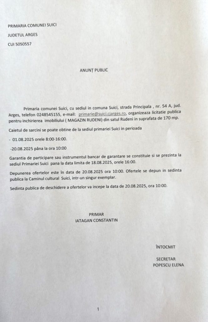 Anunturi 2024 / ANUNT nr.392 din 29.01.2026 – PROCEDURA PROPRIE ” Servicii de catering pentru prescolarii si elevii din unitatile de invatamant preuniversitar de stat de pe raza comunei SUICI, judetul Arges”